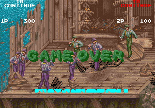 | 詳 細 | Insert 2 coins, start one player game, then when message "YOU WON'T GET AWAY THIS." appears, enter player two. The message won't get away anymore and if both players die, the message "GAME OVER" will have the message still too, though a bit messed up. This may be a bug in the game as it also happens in Raine. | ||||