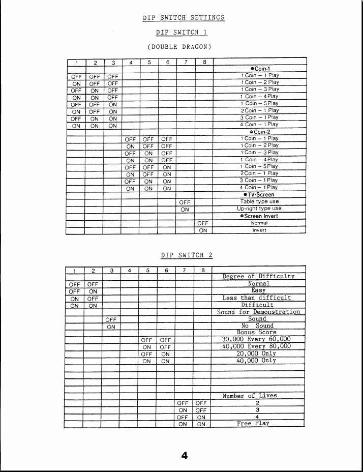 | 詳 細 | I cannot confirm which one is true, but likely Japanese one probably the correct as being original. Currently MAME uses the setting on English manual. DIP-SW1: Difficulty setting on JP: sw 1,2: OFF OFF : Normal ON OFF : EASY * (Less Then Difficult on EN manual) OFF ON : Slightly Hard * (Easy on EN manual) ON ON : Hard Same settings on EN: sw 1,2: OFF OFF : Normal OFF ON : EASY * (Slightly Hard on JP manual) ON OFF : Less Then Difficult * (Easy on JP Manual) ON ON : Difficult (HARD) I tried to test this settings but, It's hard to notice for me. Also in both manuals DIP-SW2, sw 7,8 is FREE PLAY Yes I tested this one still requires credit to play, it just makes unlimited life which mame dip also says. I suggest this one may be renamed to FREE PLAY as (unlimited life) not (Cheat). | ||||